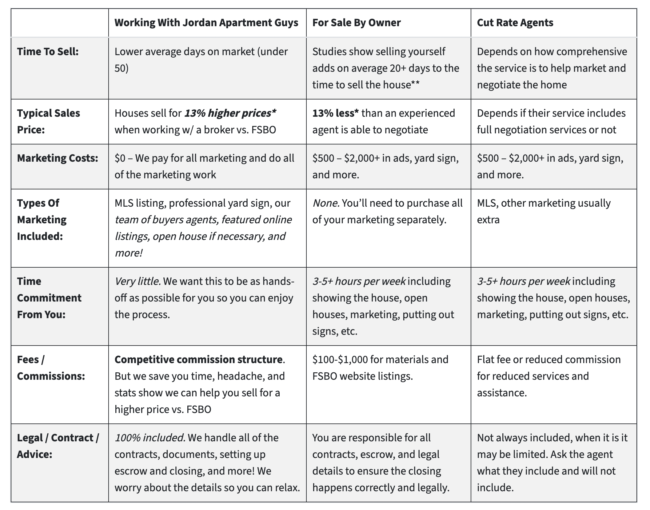 Even in a strong seller’s market, it’s smart to look at your options and see what will actually help you best reach your goals with the sale of your investment property. When it comes to selling apartments, multi-family properties, or co-ops, experience matters. Dive in and learn the differences when you work with Jordan Apartment Guys, try to sell on your own, or use a cut-rate limited service agent.